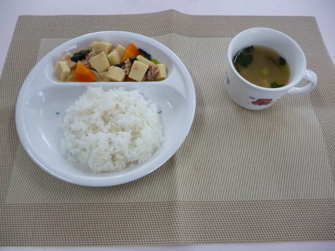 今日の給食は、「高野豆腐とツナの炒め煮」と「青菜のみそ汁」