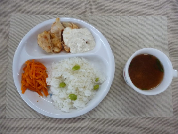今日の給食は、「えだまめごはん」、「チキン南蛮」、「にんじんのごま和え」と「キャベツのみそ汁」