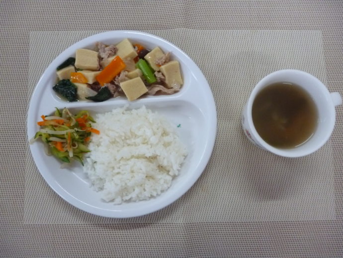 今日の給食は、「高野豆腐の中華炒め煮」、「中華風サラダ」と「中華スープ」 おやつは、「牛乳」、「バナナ」と「きなこ餅せんべい」です。