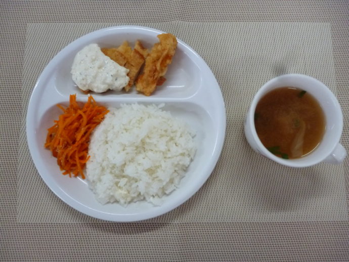 今日の給食は、「チキン南蛮」、「にんじんのごま和え」と「キャベツのみそ汁」