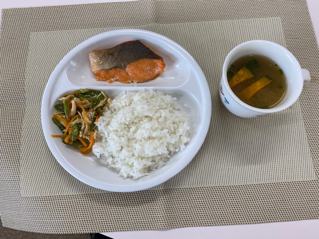 今日の給食は、「鮭の塩焼き」、「いんげんと鶏ささみのごま和え」と「かぼちゃのみそ汁」 おやつは、「牛乳」、「わらびもち」と「じゃこ揚げせん」です。