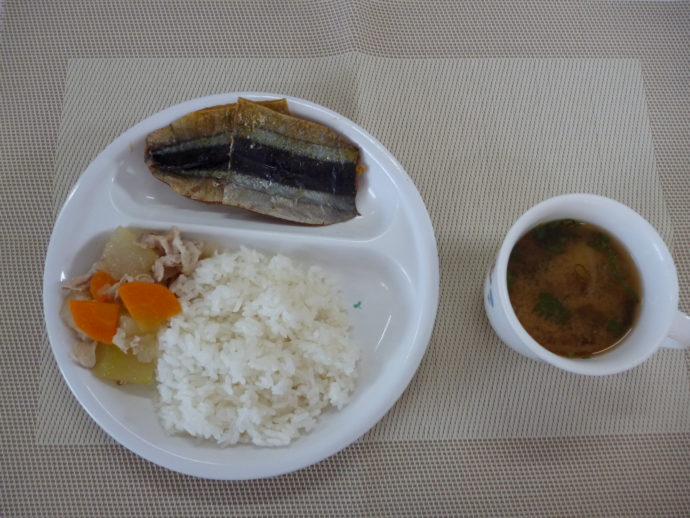 今日の給食は、「さんまのカレー焼き」、「冬瓜と豚肉の煮物」と「じゃが芋のみそ汁」