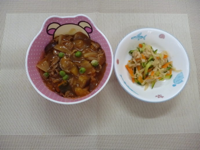 今日の給食は、「夏野菜カレー」と「切干大根のサラダ」 おやつは、「牛乳」、「オレンジ」と「ハッピーターン」です。
