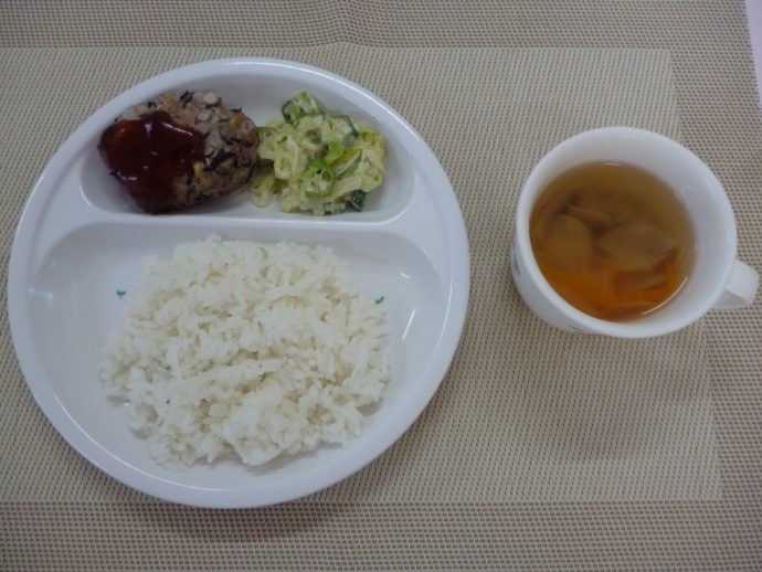 令和2年8月31日(月)の献立 2020/08/31 今日の給食は、「豆腐ハンバーグ」、「キャベツとオクラのごまマヨネーズ和え」と「コンソメスープ」 おやつは、「牛乳」、「オレンジ」と「ハッピーターン」です。