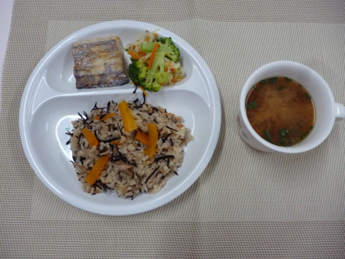 令和2年9月4日(金)の献立 2020/09/04 今日の給食は、「ひじきごはん」、「太刀魚の塩焼き」、「ブロッコリーのごま酢あえ」と 「豆腐となめこのみそ汁」 おやつは、「牛乳」、「りんご」と「源氏パイ」です。