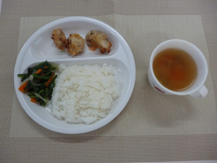 今日の給食は、「鶏肉のパン粉焼き」、「ほうれん草のソテー」と「きのこのスープ」