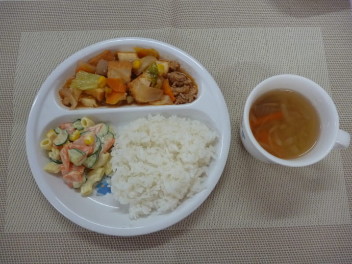 今日の給食は、「厚揚げのケチャップ煮」、「マカロニサラダ」と「オニオンスープ」