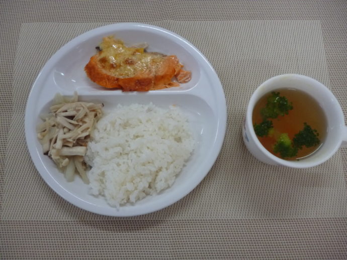 令和2年10月6日(火)の献立 2020/10/06 今日はお誕生日会です🍰 10月生まれのお友達、お誕生日おめでとう✨ 今日の給食は、「鮭のコーンマヨ焼き」、「きのことベーコンのソテー」と「コンソメスープ」 おやつは、「牛乳」、「さつまいもケーキ」と「ビスコ」です。
