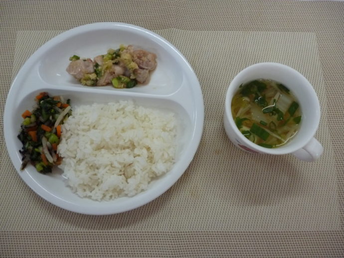 今日の給食は、「鶏肉のレモン醤油焼き」、「チンゲン菜の磯和え」と「豆腐のすまし汁」