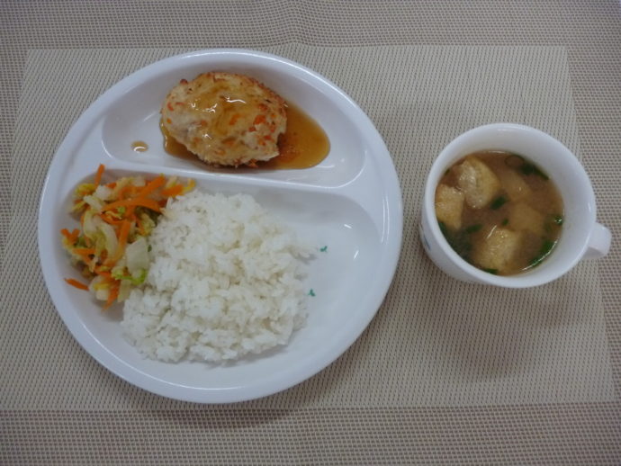 今日の給食は、「鶏つくねのあんかけ」、「白菜のごま酢和え」と「里芋のみそ汁」 おやつは、「牛乳」、「ミルクあべかわ」と「新潟仕込み」です。