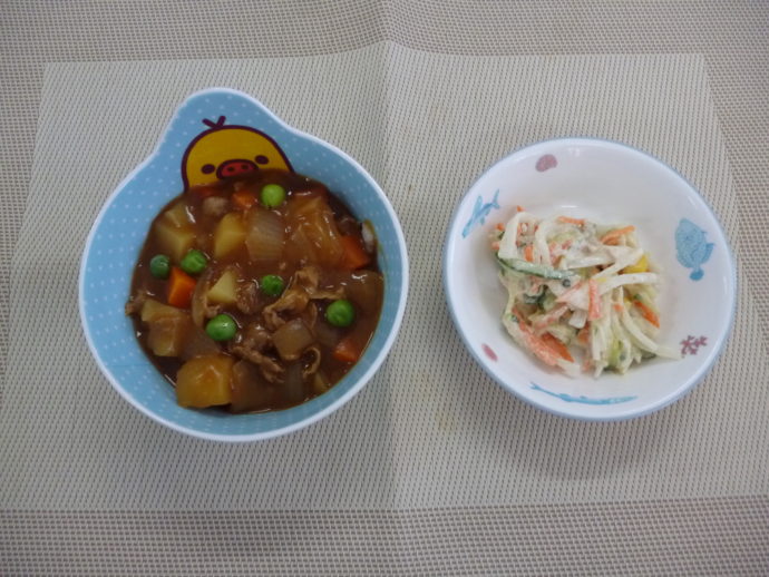 今日の給食は、「カレーライス」と「大根とツナのサラダ」