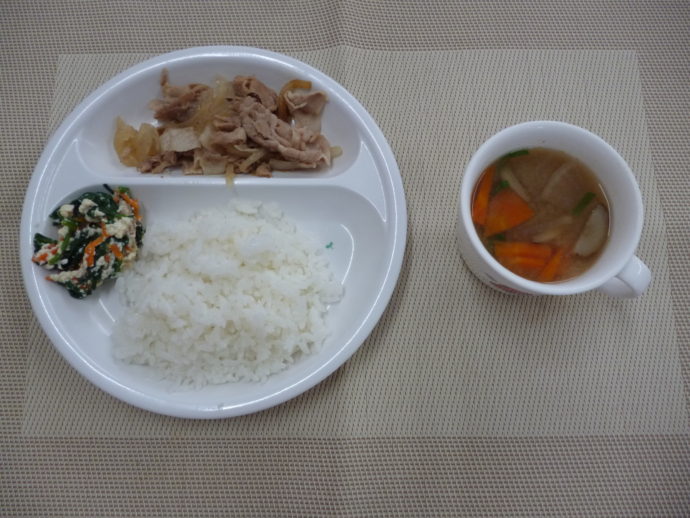 今日の給食は、「豚肉のしょうが焼き」、「白和え」と「さつま汁」 おやつは、「牛乳」と「ポンデケージョ」です。