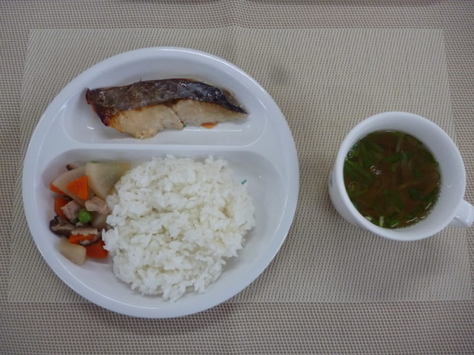 今日の給食は、「さわらの西京焼き」、「大根と鶏肉の煮物」と「キャベツのすまし汁」