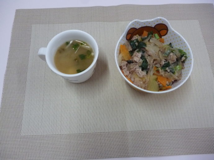 今日の給食は、「豚丼」と「あおさのみそ汁」 おやつは、「牛乳」と「お楽しみおやつ」です。
