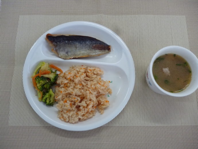 令和2年11月24日(火)の献立 2020/11/24 今日の給食は、「もみじごはん」、「あじの塩焼き」、「ブロッコリーのごま和え」と「豚汁」 おやつは、「牛乳」、「きなこ蒸しパン」と「野菜かりんとう」です。