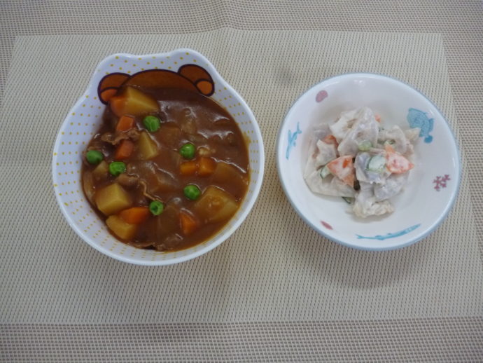 今日の給食は、「カレーライス」と「れんこんサラダ」