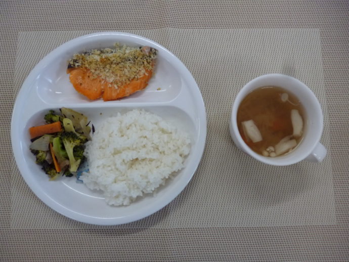 今日の給食は、「鮭のパン粉焼き」、「ブロッコリーとひじきのソテー」と「きのこのスープ」