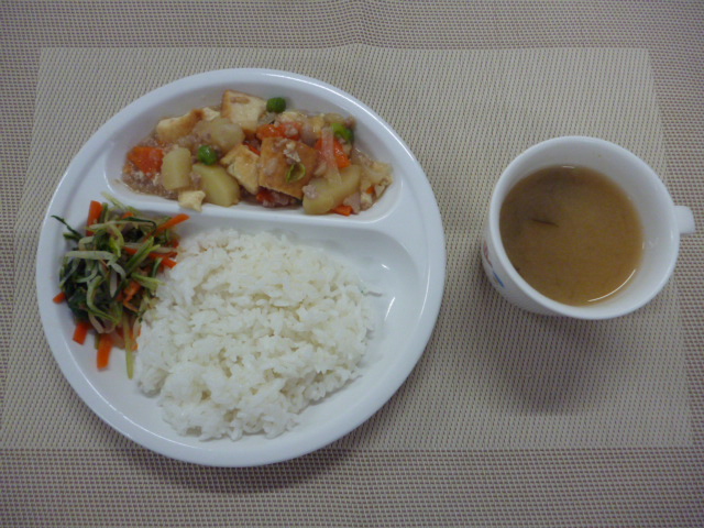 今日の給食は、「厚揚げとじゃが芋のそぼろ煮」、「水菜のおかか和え」と「玉ねぎのみそ汁」 おやつは、「牛乳」、「黒糖蒸しパン」と「チーズ」です。