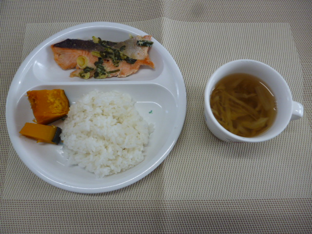 今日の給食は、「鮭のねぎみそ焼き」、「かぼちゃの煮つけ」と「キャベツのすまし汁」 おやつは、「牛乳」と「おからドーナツ」です。