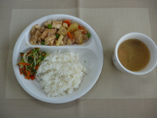今日の給食は、「厚揚げとじゃが芋のそぼろ煮」、「水菜のおかか和え」と「玉ねぎのみそ汁」 おやつは、「牛乳」、「黒糖蒸しパン」と「チーズ」です。