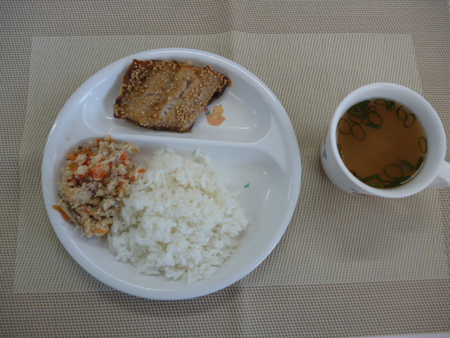 今日の給食は、「さわらのごま焼き」、「卯の花炒り」と「かぼちゃのみそ汁」