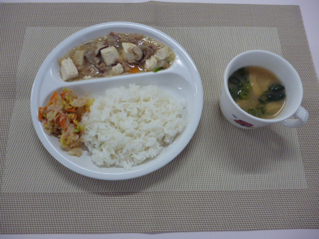 今日の給食は、「豆腐の肉あんかけ」、「白菜とツナのごま和え」と「大根のみそ汁」