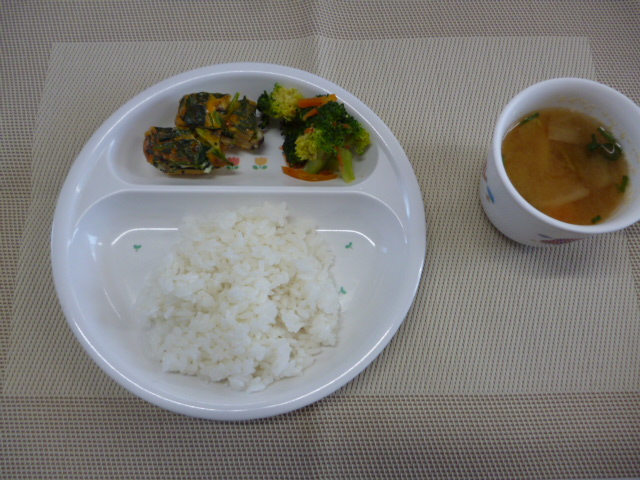 今日の給食は、「千草焼き」、「ブロッコリーのおかか和え」と「白菜のみそ汁」 おやつは、「牛乳」、「ミルク蒸しパン」と「ハッピーターン」です。