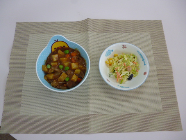 今日の給食は、「カレーライス」と「ひよこ豆のサラダ」 おやつは、「牛乳」、「みかん」と「ぽたぽた焼き」です。